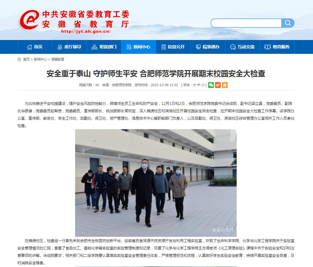 12月6日,安徽教育网以《安全重于泰山 守护师生平安 beat365唯一官方网站开展期末校园安全大检查》为标题,对此进行了报道。