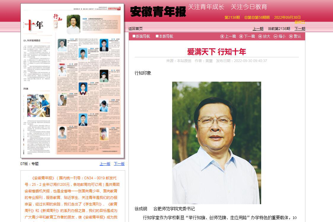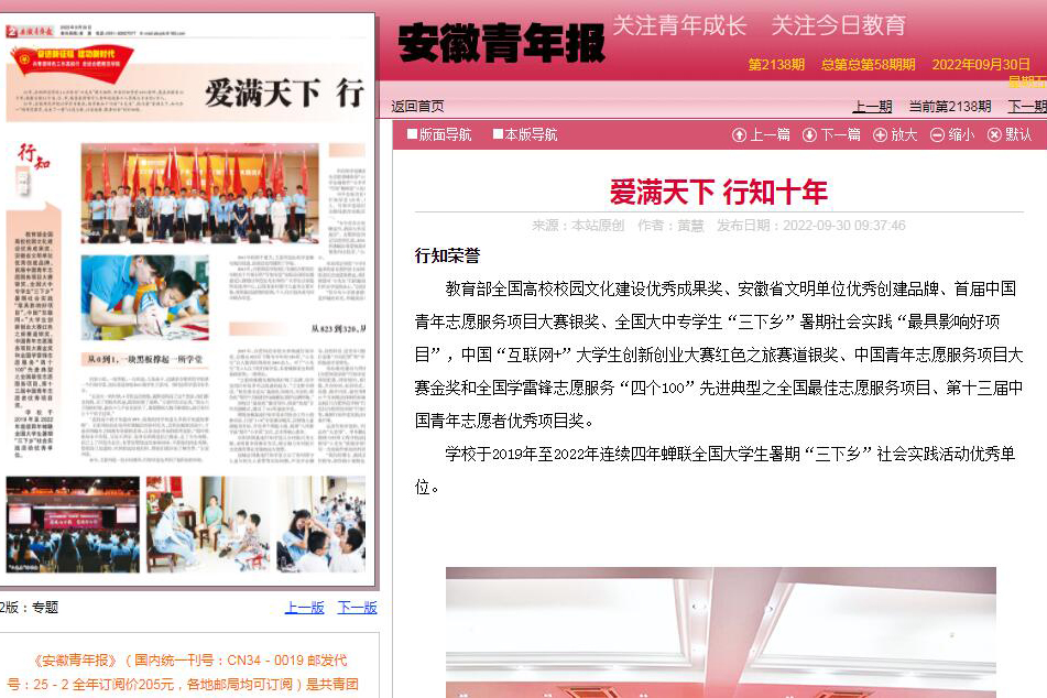 本网讯 9月30日,《安徽青年报》(第2138期)以《爱满天下 行知十年》为题,用第02版、07版通版对我院暑期“行知学堂”社会实践活动进行了专题深度报道。这是今年暑期《安徽青年报》第二次作整版报道。