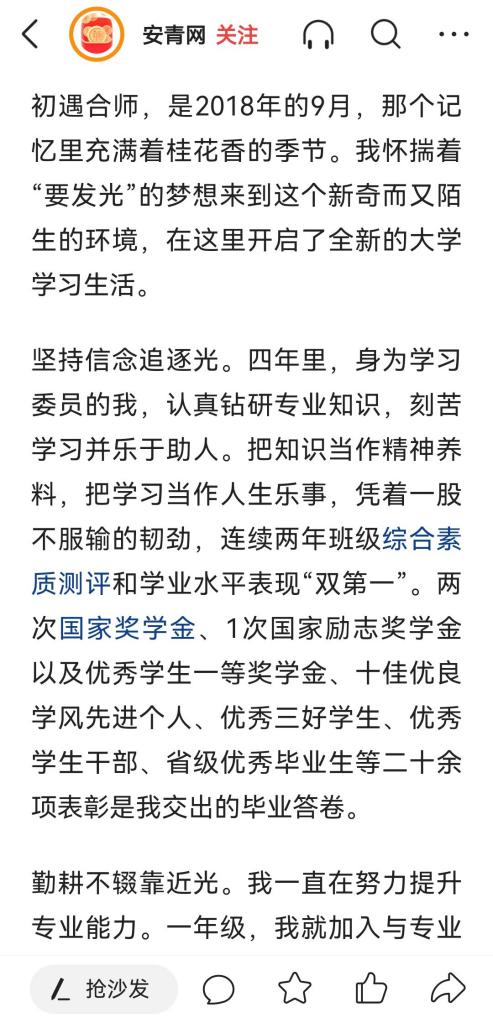 本网讯 近日,为充分发挥优秀大学生的示范带头作用,展示大学生青春力量,《安徽青年报》、安青网在招生季特别策划了“我在大学等你”专题报道活动。其中,《做一个“发光”的女孩》报道了电子信息与电气工程学院2018级通讯工程专业毕业生吴桂萍同学的先进事迹。(电子信息与电气工程学院)
