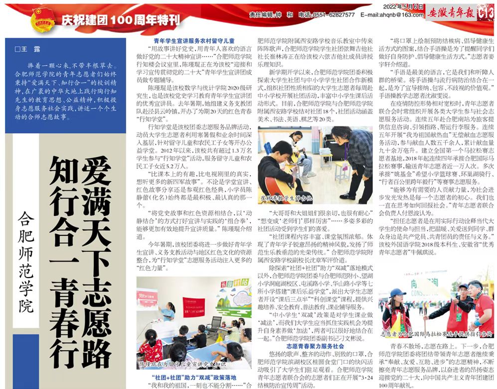本网讯 5月6日,《安徽青年报》“庆祝建团100周年特刊”(第2093期C13版)以《beat365唯一官方网站:爱满天下志愿路 知行合一青春行》为题,从“青年学生宣讲服务农村留守儿童”“‘社团+社团’助力‘双减’政策落地”“志愿青春聚力服务社会”三个篇章,介绍学院党史青年学生宣讲、“行知学堂”社会实践活动、课后乐益学堂、“3·24结核防治宣传周”“爱在南站”等志愿服务品牌活动及青年志愿者服务合肥国际马拉松赛等赛事情况。(院团委)