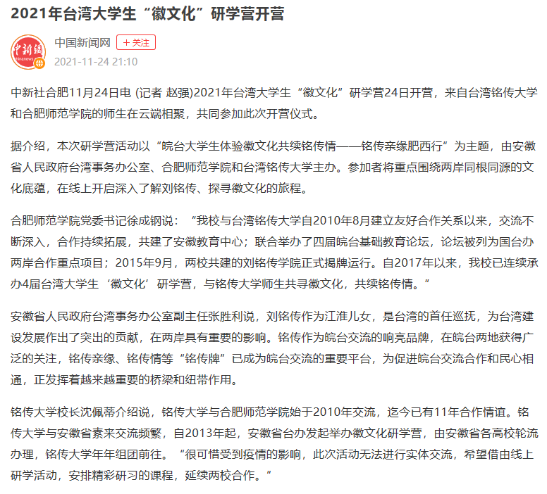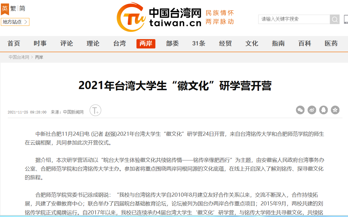 中新网等报道我院2021年台湾大学生“徽文化”研学营活动