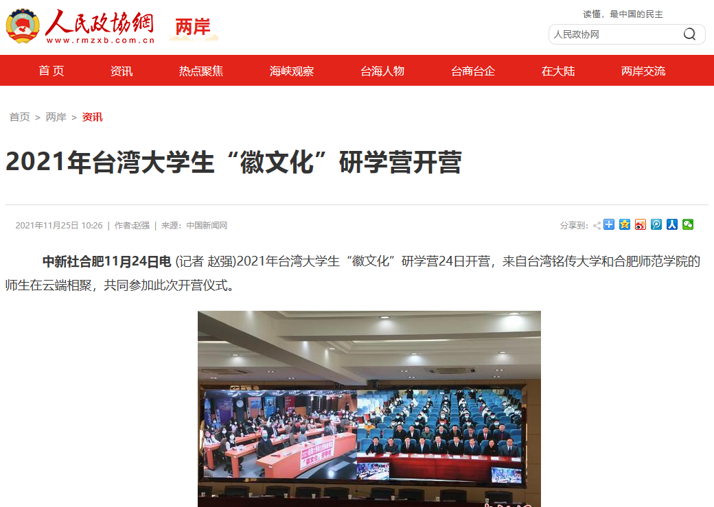 本网讯 11月24日,2021年台湾大学生“徽文化”研学营开营,来自台湾铭传大学和beat365唯一官方网站的师生在云端相聚,共同参加此次开营仪式。中国新闻网、人民网、人民政协网、中国台湾网、凤凰网等对此进行了报道。