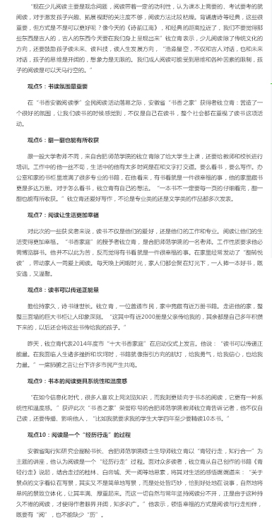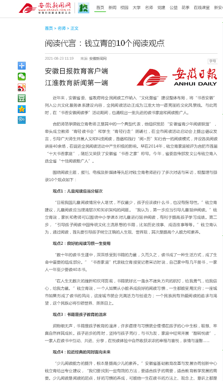 本网讯 近日,安徽新闻网围绕阅读主题,整理与撷录我院机关二党委书记、科研处副处长钱立青近年来接受报刊、电视、新媒体等对话与采访,梳理其十大阅读观点并进行了报道。钱立青作为读书家庭和阅读推广的典型代表,组织发起“安徽省青少年阅读联盟”,牵头成立教师“青轻读书会”和学生“青轻行走”朗诵社,在全市阅读活动启动会上提出倡议发言,引导广大师生开展人文和科技阅读,首倡和践行“阅+历”知行合一的阅读模式,开设各类阅读讲座40余场,在促进全民阅读活动中产生积极的影响。其家庭被评为安徽省“书香之家”称号、合肥市首届“十大书香家庭”。今年,省委宣传部发文公布钱立青入选全省“十佳阅读推广人”。(新闻中心)