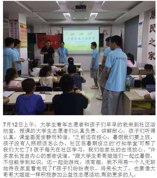 本网讯 7月12日,教师教育学院“六安鼓楼行知学堂”在六安市鼓楼街道锥子庙社区顺利开班,小先生团队由我校教师教育学院、物理与材料工程学院以及安徽外国语学院、安徽新闻出版学院共8名小先生组成。课程内容包括党史学习教育、书法教学、心理辅导、素质拓展等。