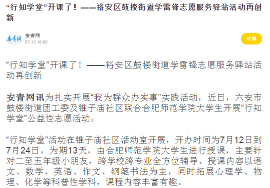 7月13日,六安交通音乐广播对此进行了报道。(教师教育学院:王磊)