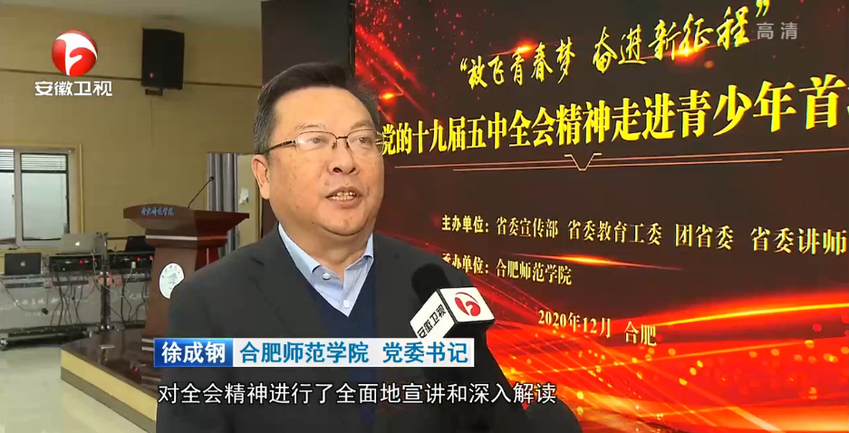 《安徽新闻联播》记者对我院党委书记徐成钢和学生代表文学院邓子怡同学进行了采访,并以“安徽:推动十九届五中全会精神走进青少年”为题对本次活动进行了报道。(新闻中心)