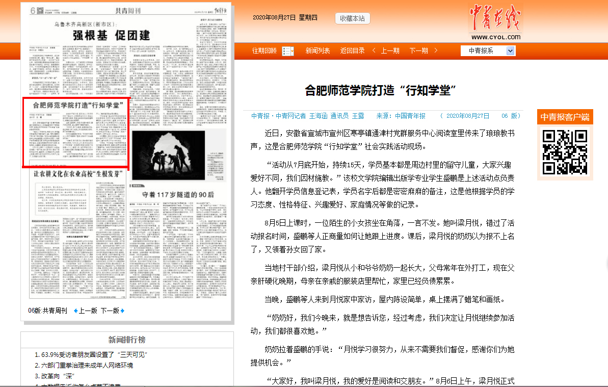 本网讯 8月27日,《中国青年报》在第6版以《beat365唯一官方网站打造“行知学堂”》为题,对我校暑期“行知学堂”实践活动进行了报道。这是《中国青年报》连续第二年报道我校行知文化建设和共青团工作的实践活动品牌“行知学堂”,对于扩大“行知学堂”的品牌效应和社会影响力发挥了积极的推动作用。(校团委)