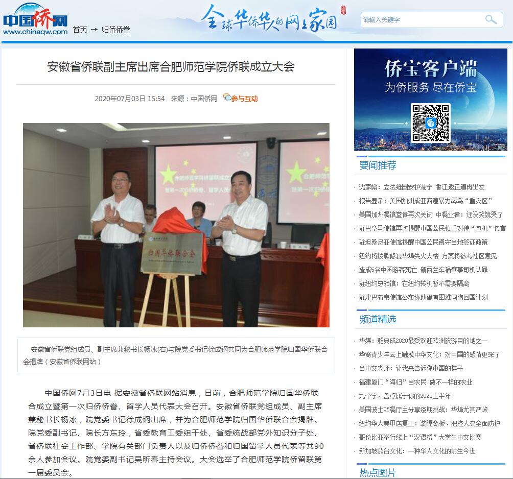 中国侨网、安徽侨联网报道我院归国华侨联合会、留学人员联谊会成立