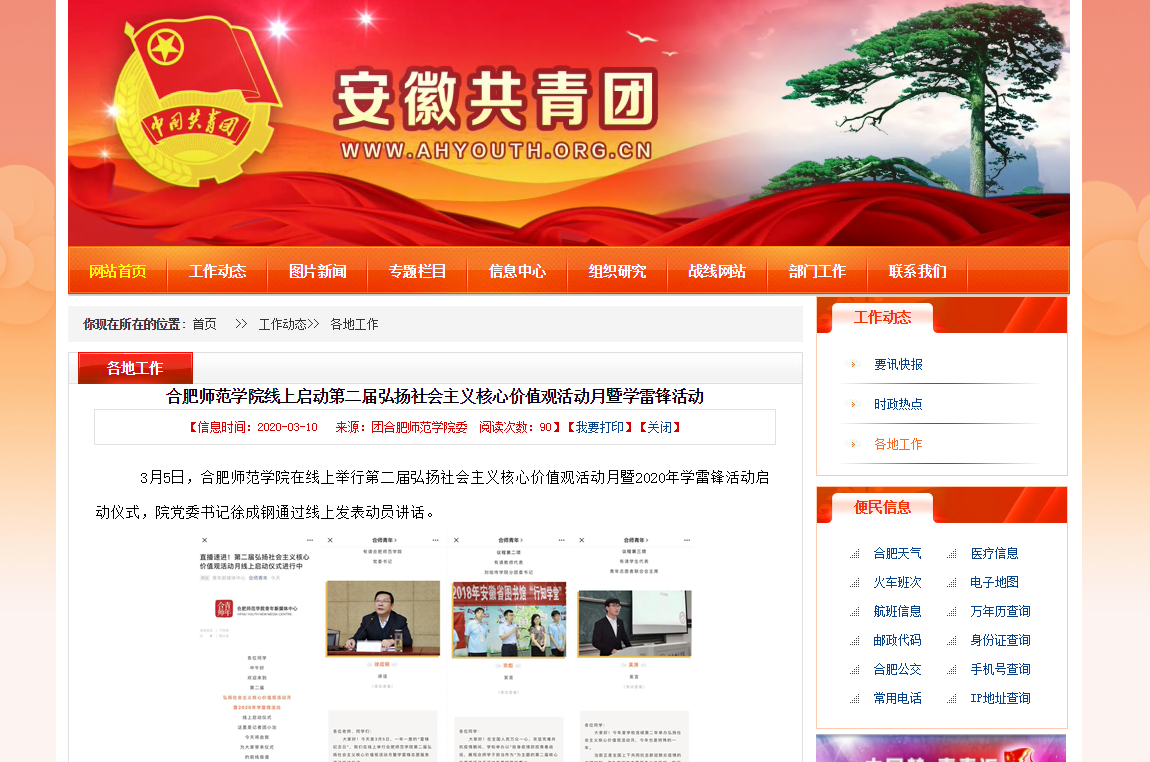 本网讯 3月10日,共青团安徽省委官方门户网站安徽共青团网对我院线上启动第二届弘扬社会主义核心价值观活动月暨2020年度学雷锋志愿服务活动情况进行了报道。(院团委)