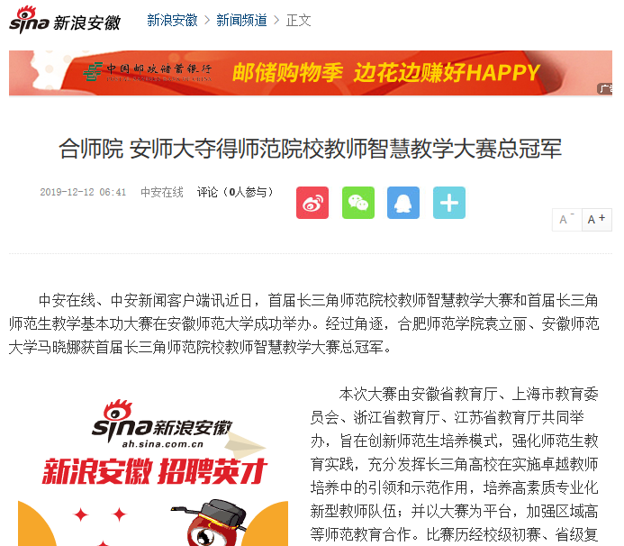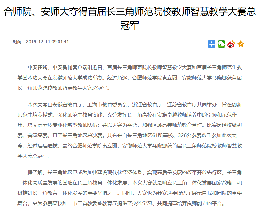中安在线、新浪网报道我院夺得首届长三角师范院校教师智慧教学大赛总冠军