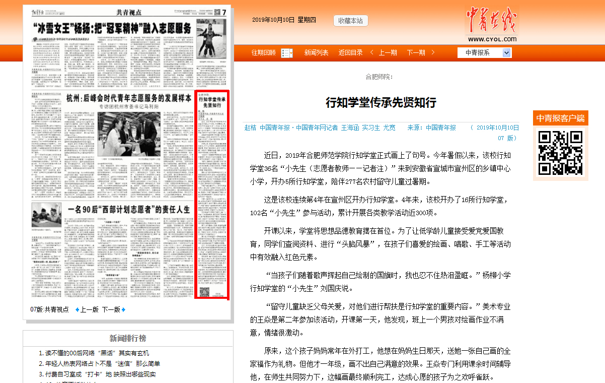 本网讯 10月10日,中国青年报以《合肥师院:行知学堂传承先贤知行》为题,对我院2019年宣州区行知学堂活动情况进行了深度报道。(院团委)
