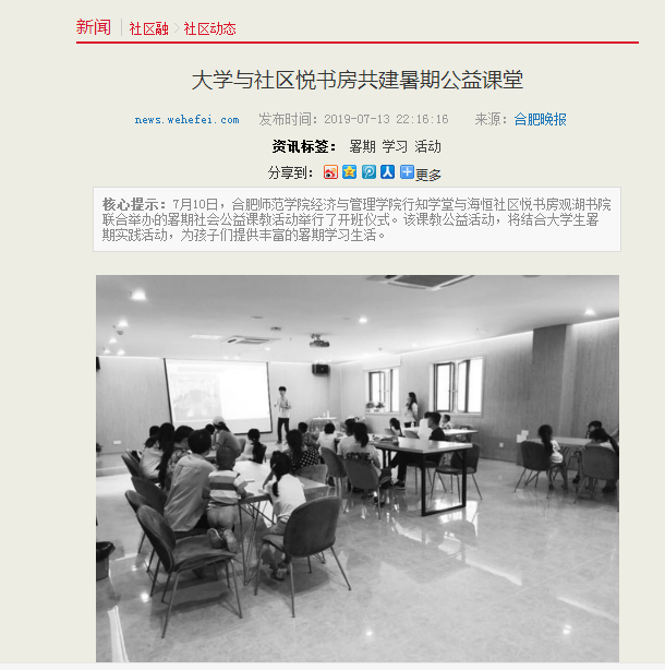合肥晚报报道经济与管理学院海恒社区“行知学堂”