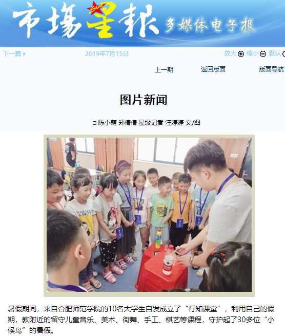 本网讯 近日,来自我院教师教育学院的10名大学生自发成立了“行知课堂”,利用自己的假期,教授学校附属实验小学(锦绣小学)的留守儿童音乐、美术、街舞、手工、棋艺等课程,守护起了30多位“小候鸟”的暑假。