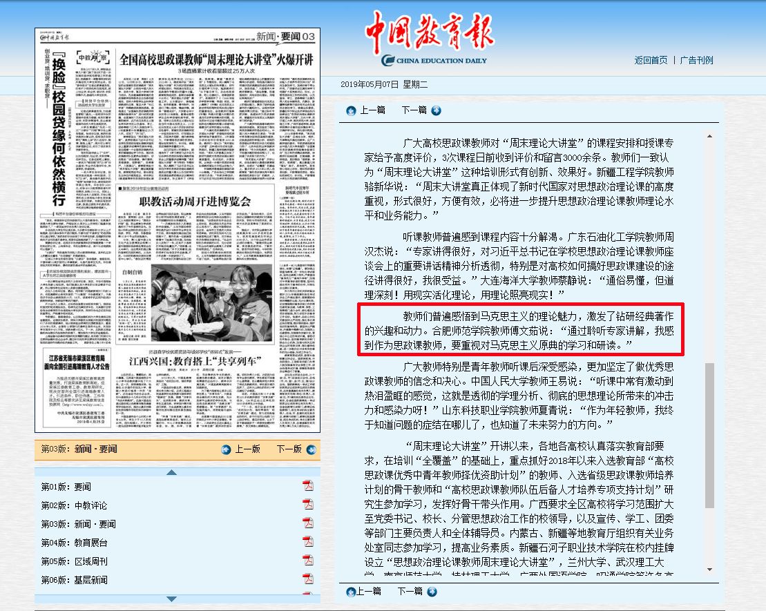 中国教育报刊发了专题新闻《全国高校思政课教师“周末理论大讲堂”火爆开讲》,其中报道了我院马克思主义学院思政课教师傅文茹副教授参加该讲堂的心得体会。(新闻中心)