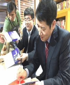 2015年1月上旬,沈清华(右一)和北大汇丰商学院院长海闻教授应邀在天津跨界书店给读者签名《商界军校》